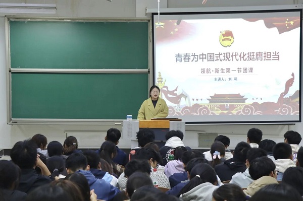 为全面学习贯彻习近平新时代中国特色社会主义思想,帮助2025级新生快速融入团组织、明确青春使命,数学与统计学院于10月28日晚在理工楼西阶201举行“领航·新生第一节团课”活动。本次团课由院团委副书记刘咪主持。